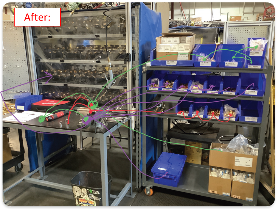 Material flow: Streamlined the assembly steps to remove wasted motion.